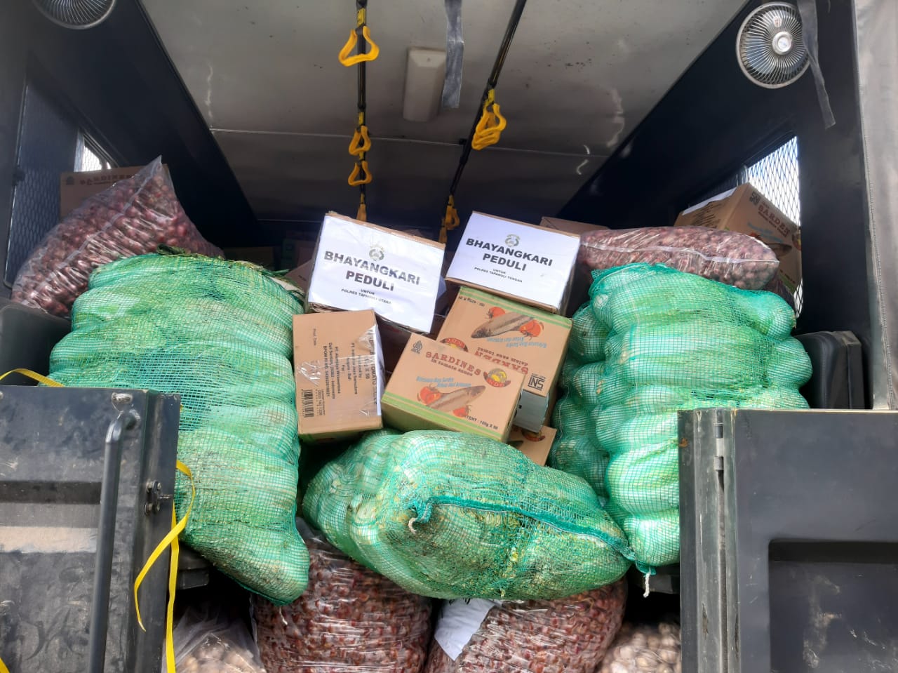 Bantuan terdiri dari Wortel 240 kg, Kentang 180 kg, Cabe merah 180 kg, Tomat 300 kg, Sawi putih 300 kg, Jipang 360 kg, Sarden kaleng 75 dus, Jahe merah 6 karung, Garam 60 bal, Bawang merah 6 karung, Bawang putih 6 karung, Beras 2 goni, Telur 2 papan, Mie instan 4 kotak.