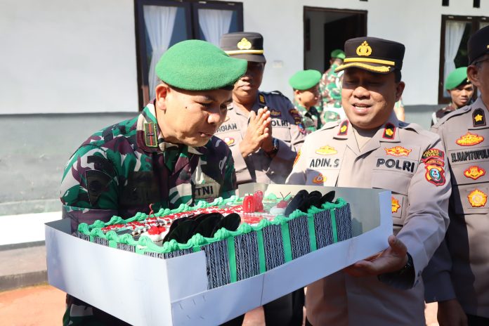 TOBA -RajaPewarta. Com-Wakapolres Toba Kompol Marluddin., S.Ag., M.H., didampingi sejumlah PJU dan perwira Polres memberikan suprise berupa kue ultang tahun dalam rangka HUT TNI ke-80 di 2 lokasi yaitu di Mako Kompi Senapan A Yonf 125 Simbisa dan Sub Denpom 1/2 -6 Balige, Minggu (5/10/2025)