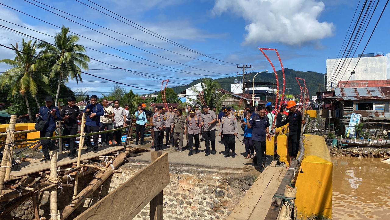 Selanjutnya, Kapolri, didampingi Dankor Brimob Polri Komjen Pol. Ramdani Hidayat, Pejabat Utama Mabes Polri, serta Ketua Umum Bhayangkari, melaksanakan peninjauan lanjutan ke Jembatan Putus (Jembatan Halangan) di Jalan Lintas Sibolga–Padang Sidempuan. Pada lokasi tersebut, Kapolri memastikan percepatan penanganan infrastruktur terdampak sekaligus menyerahkan bingkisan kepada masyarakat di sekitar titik jembatan terputus.